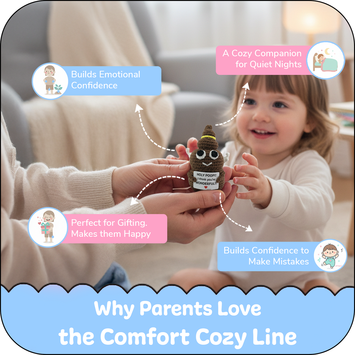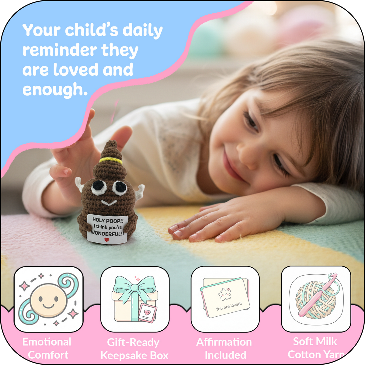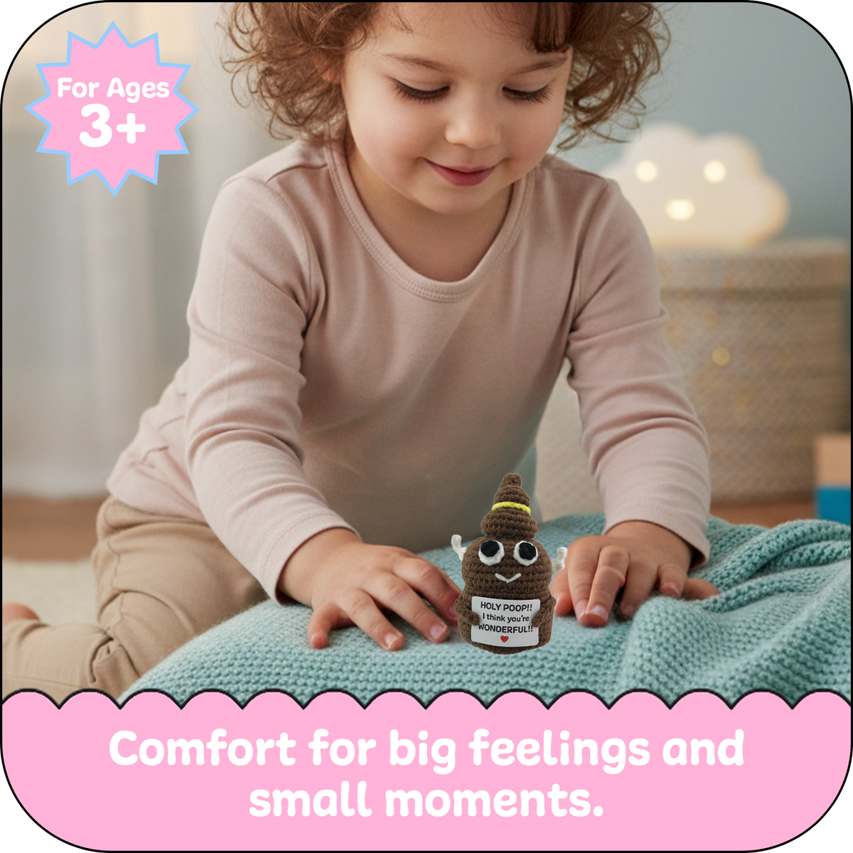 For moments that need a little courage and a little light, the Comfort Cozy Line Holy Ploppal is a reminder that every child is wonderful just as they are. Hand-crocheted with soft yarn and holding an encouraging affirmation, it boosts confidence and positivity—helping kids feel safe, supported, and special.