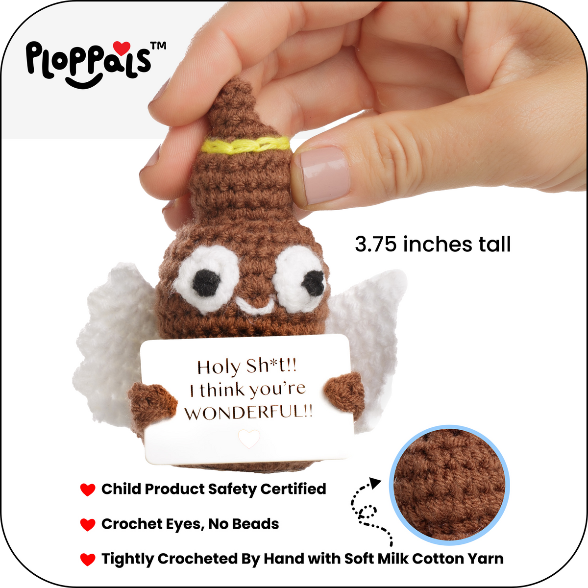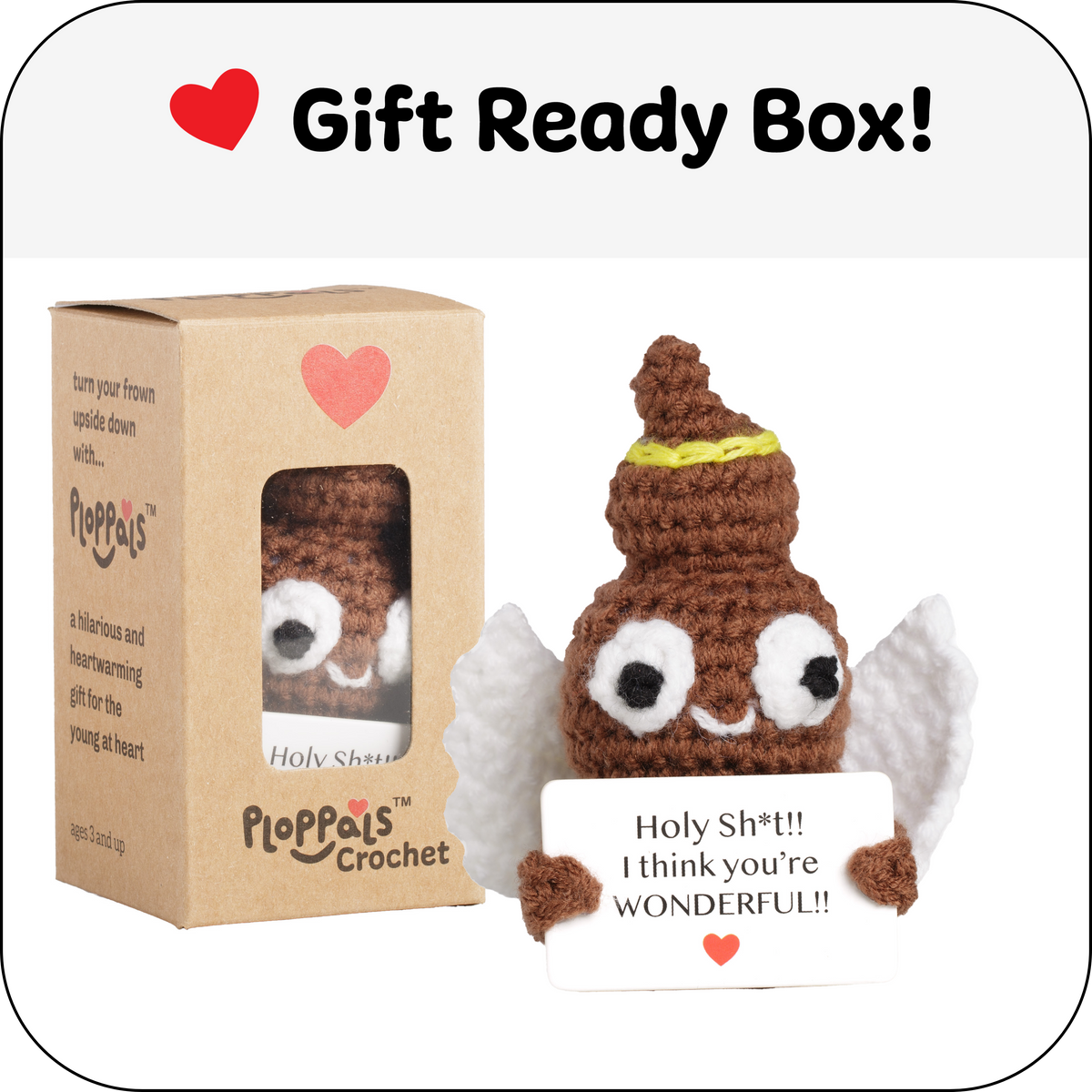 When words fall short, let the Small & Sassy Holy Ploppal do the talking. This handcrafted, poop-shaped plush toy features crocheted wings, a cheerful halo, and an uplifting card that reads, “Holy Sh*t!! I think you’re WONDERFUL!!”